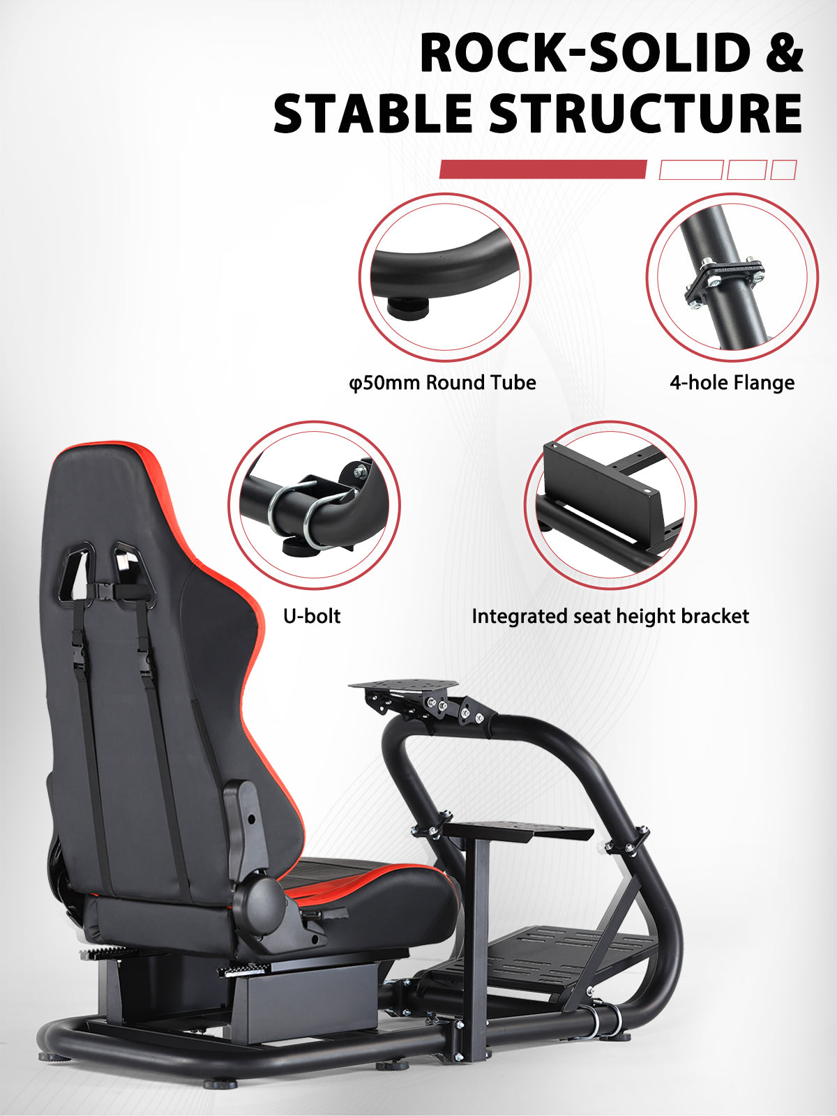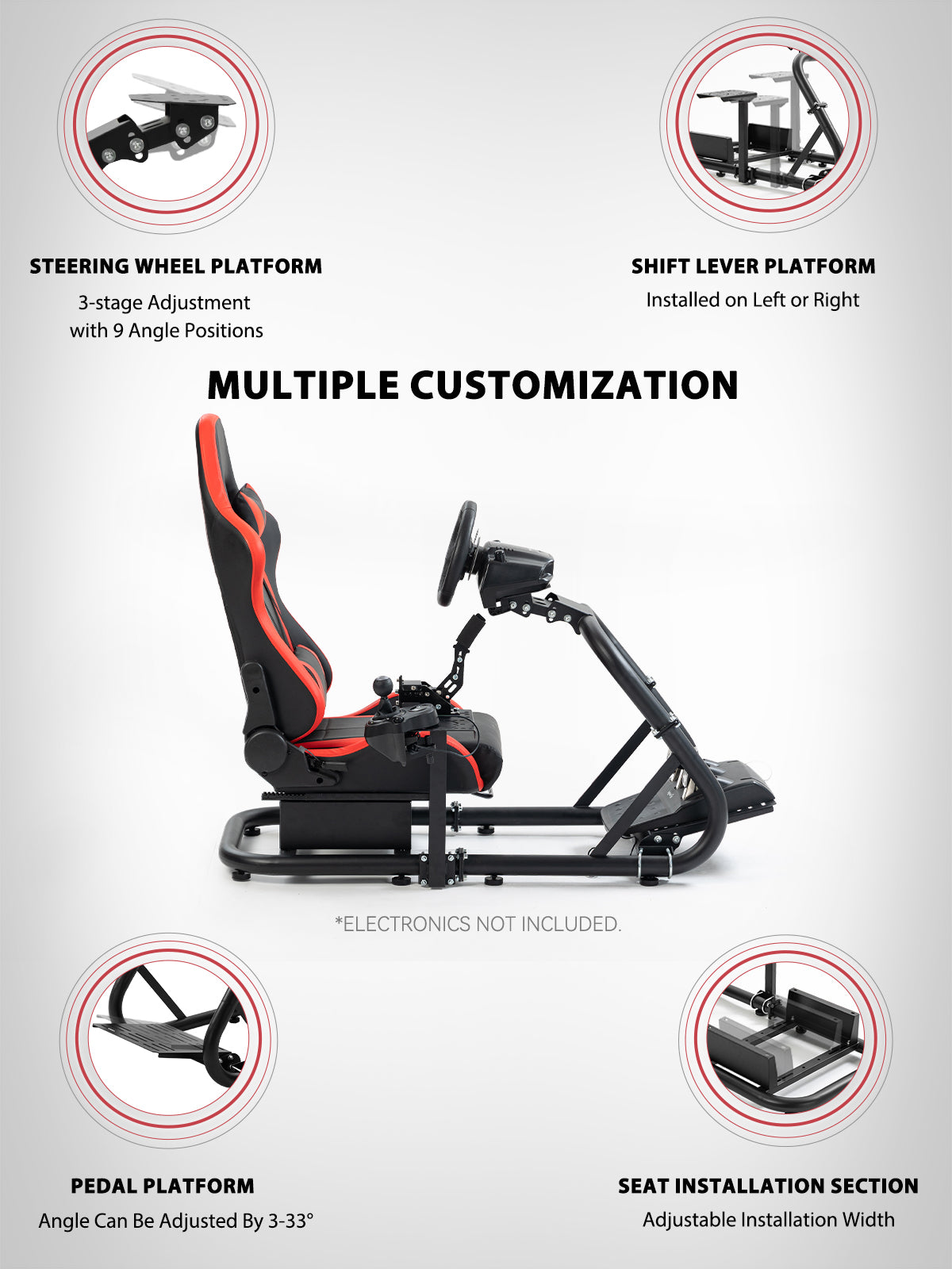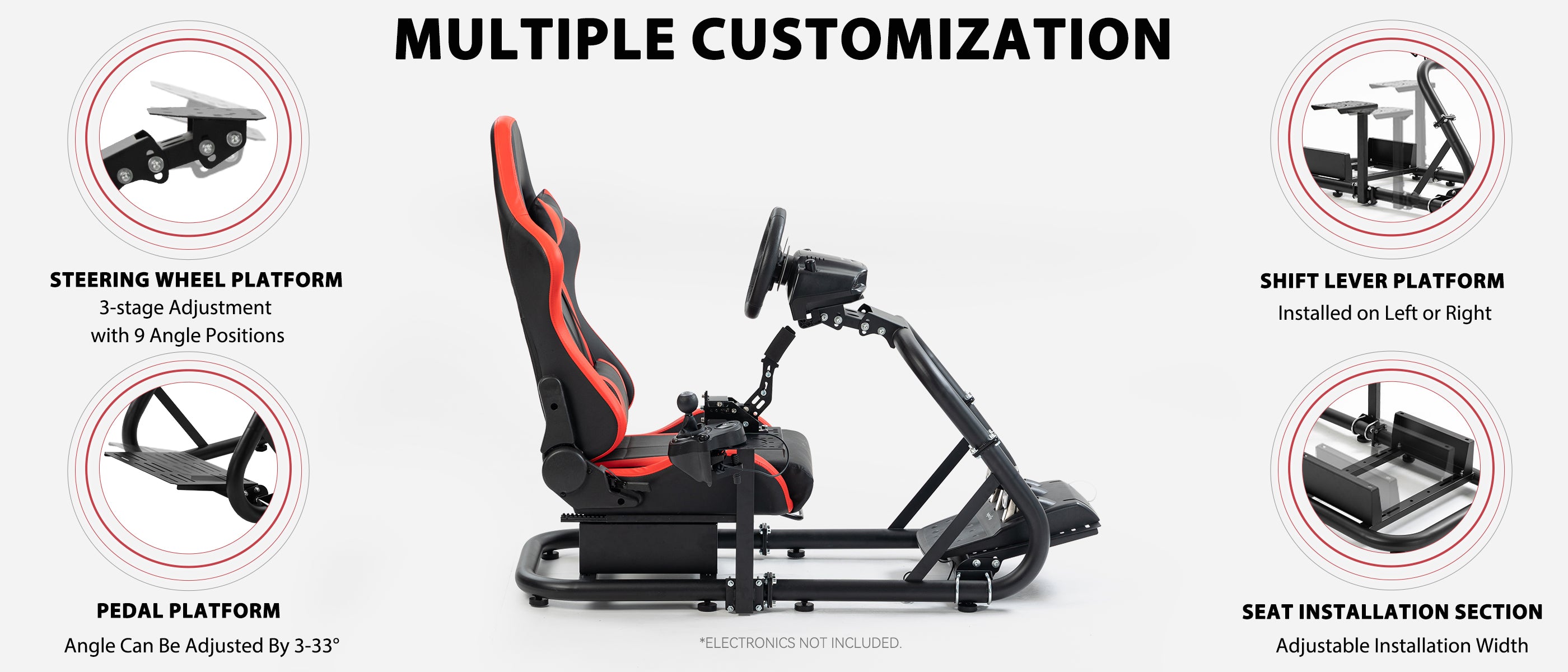 【Multi-Angle Adjustment】 Steering wheel platform supports two-stage height and angle adjustment, with customizable pedal angle and shift lever position for optimized comfort.