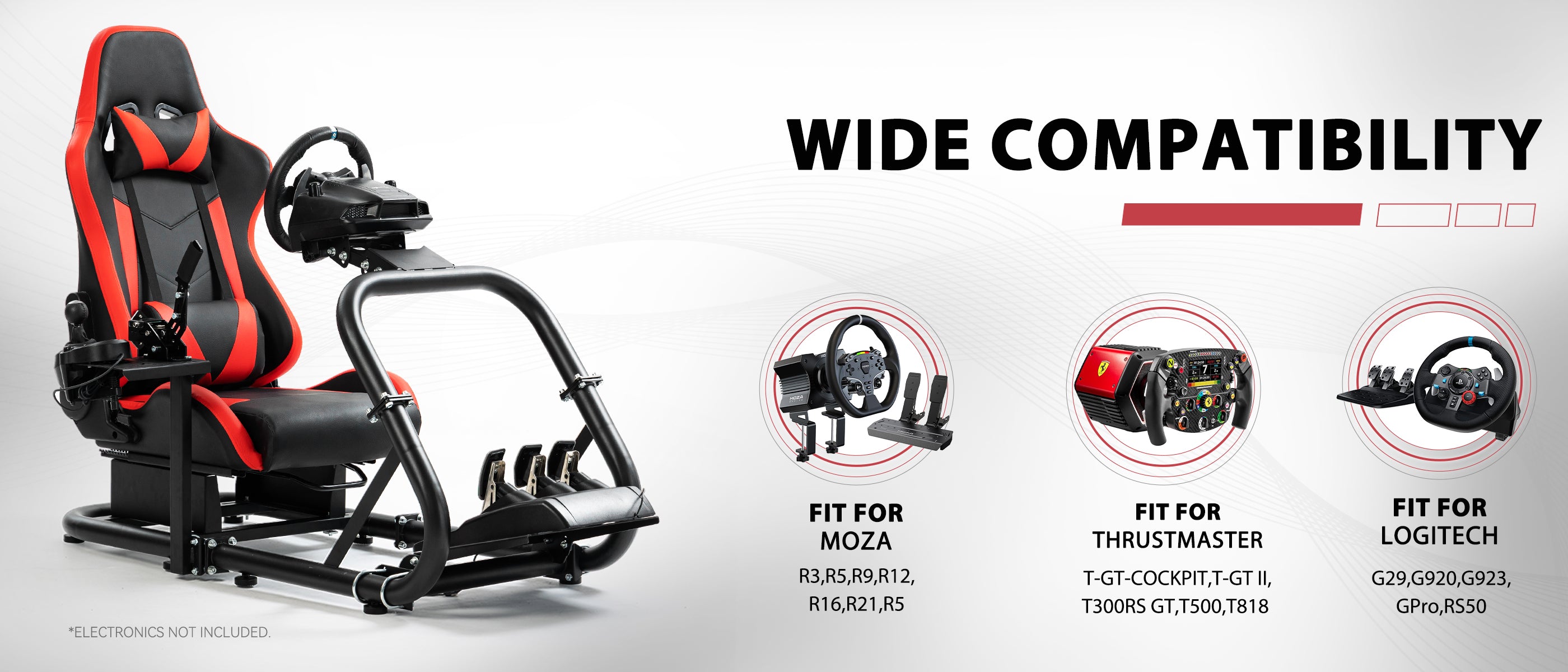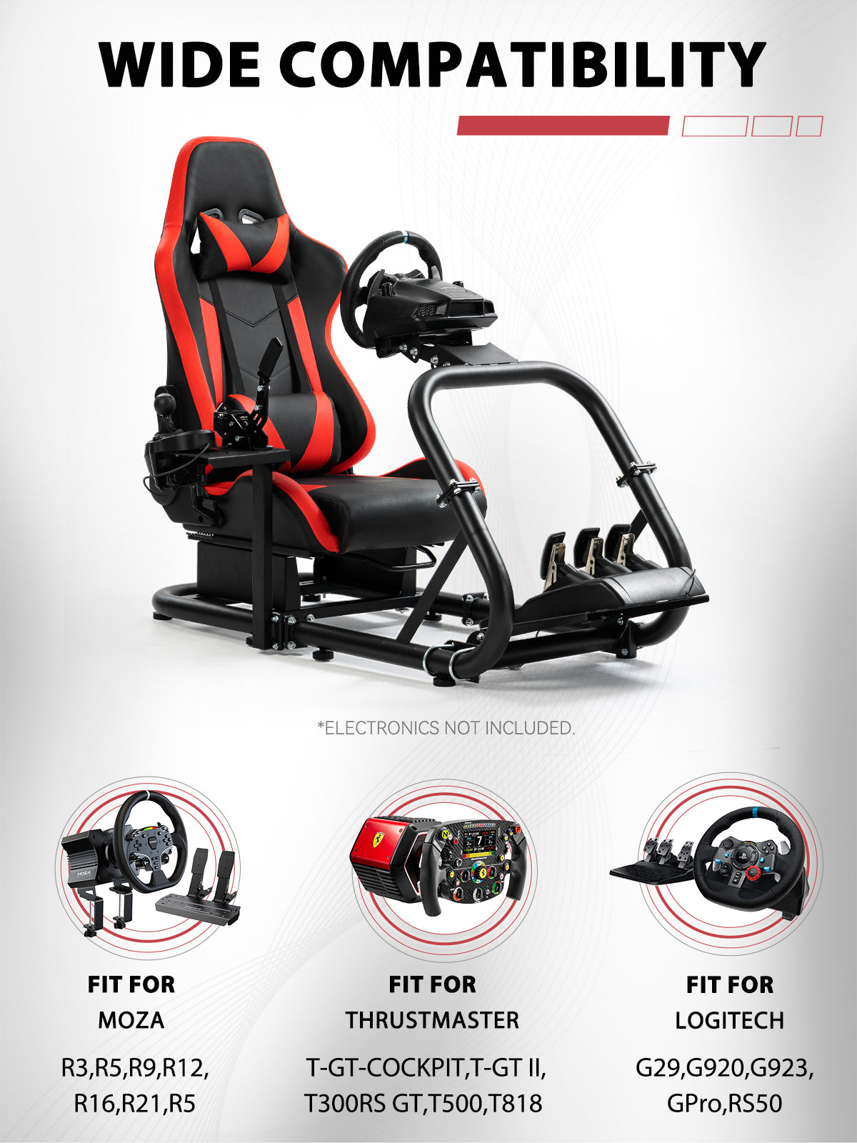 【High Adaptability】 Universal mount compatible with Logitech, Fanatec, and Thrustmaster racing wheels, pedals, and shifters. Supports direct drive wheels, TV bracket mounting, and DIY modifications.