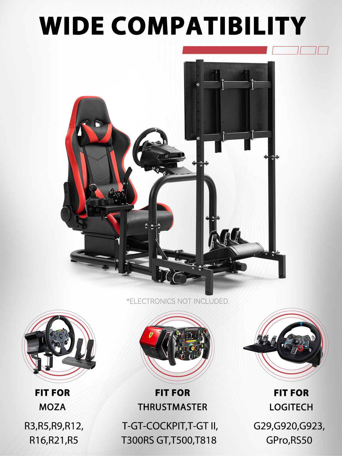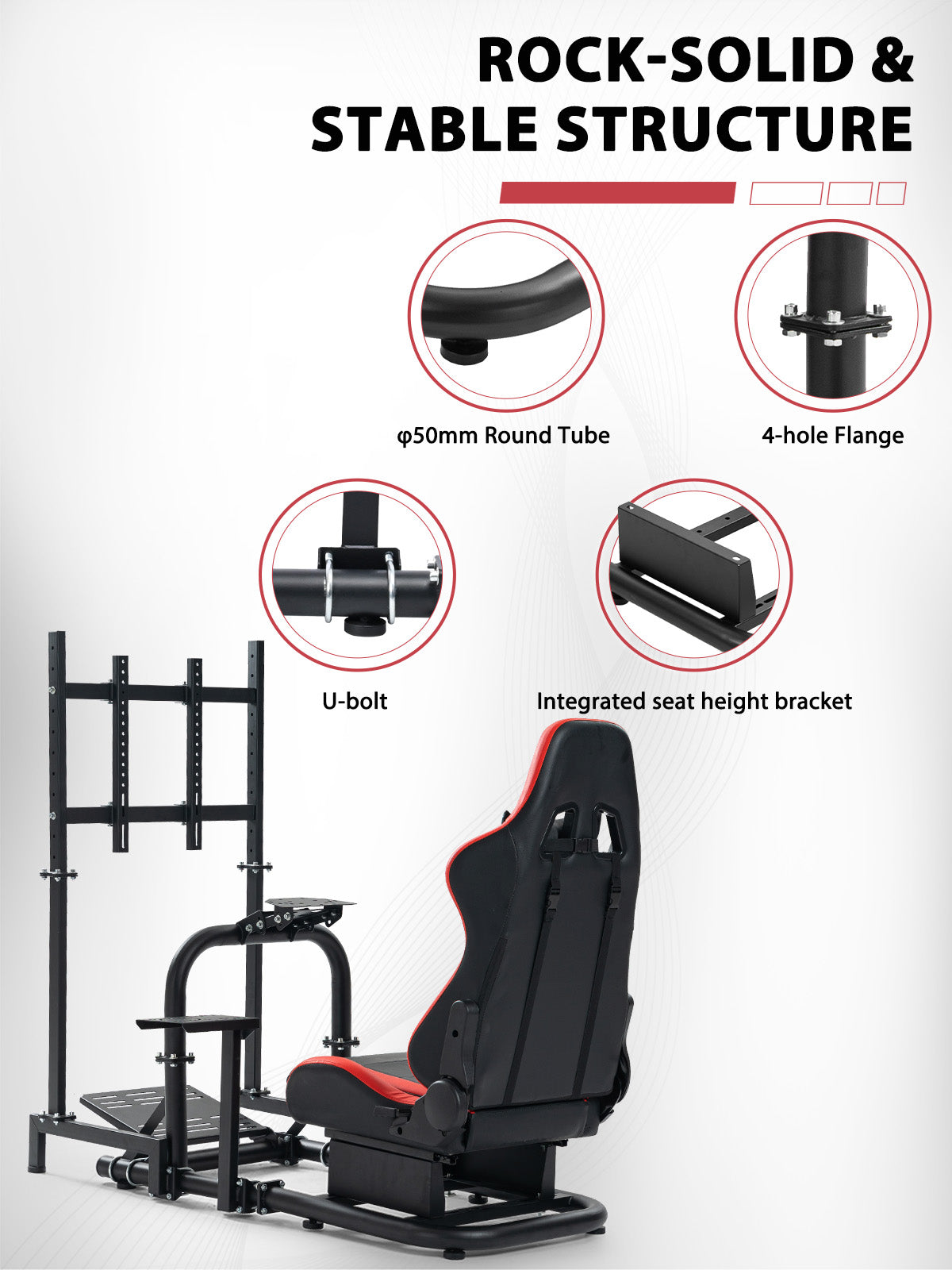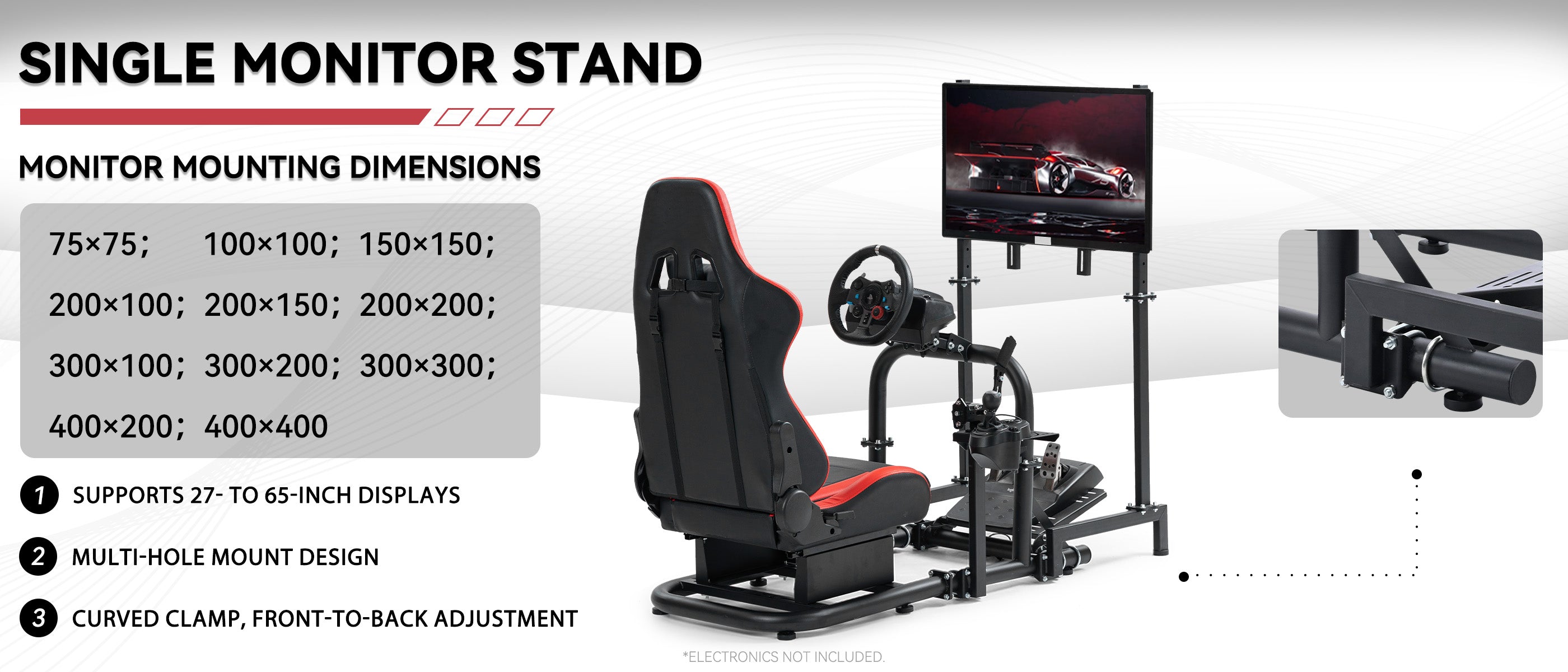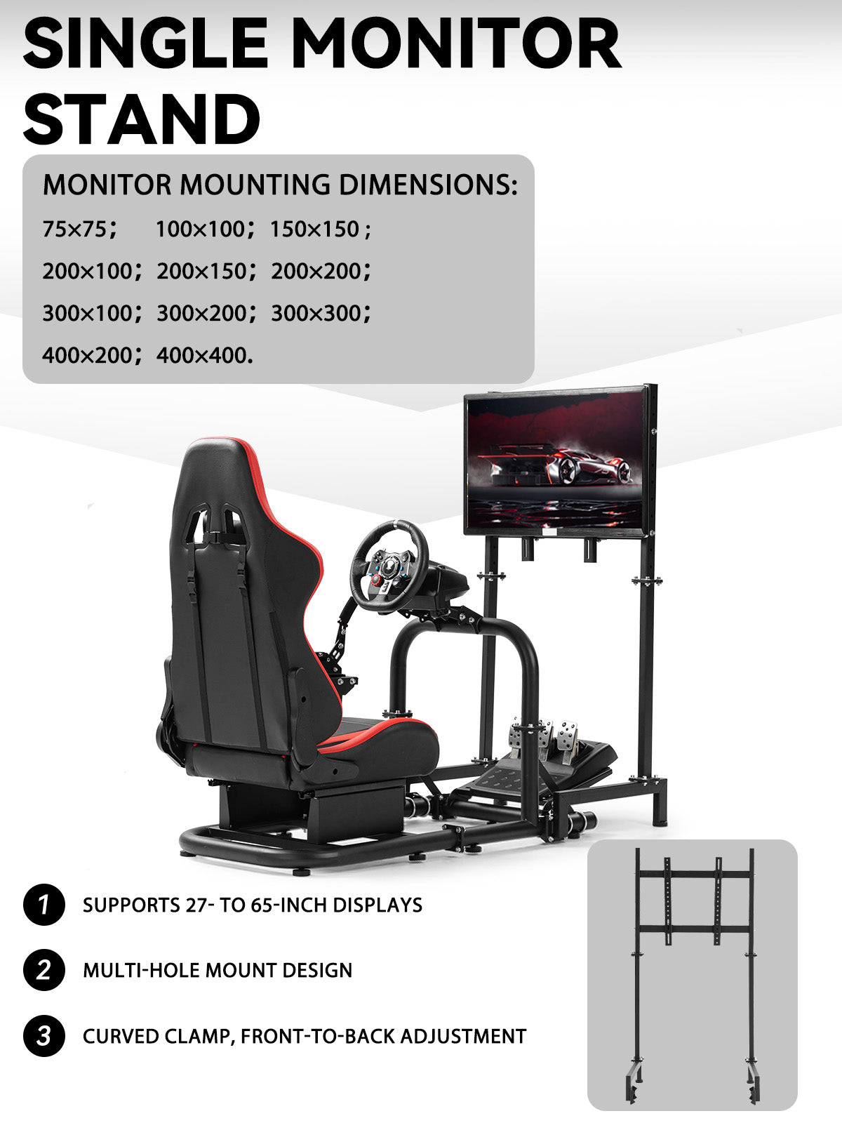 【Leading-edge Monitor Mount 】Heavy-duty monitor mount supports 27- to 65-inch screens up to 220 lb, with flexible height/distance adjustments to address visual fatigue during endurance racing simulations