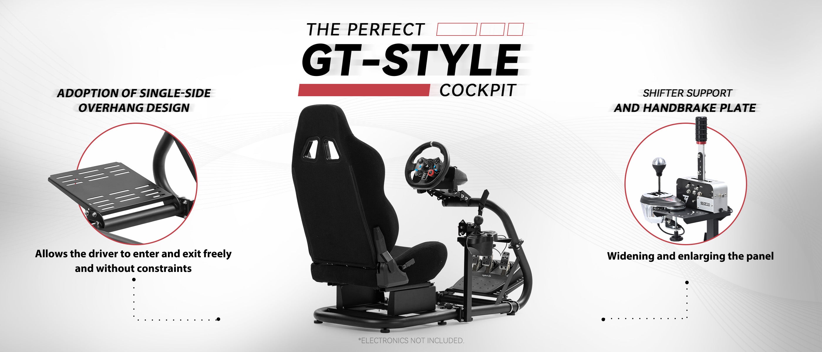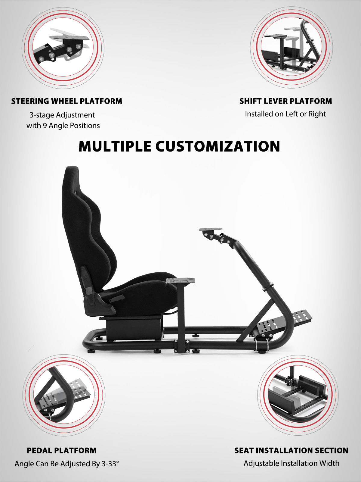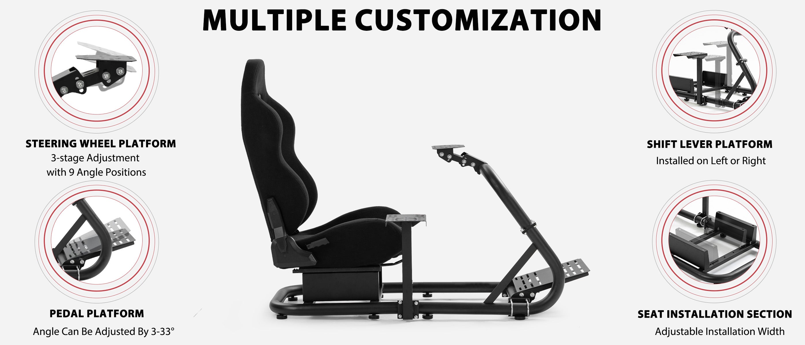 【Fully Adjustable】Steering wheel angle, pedal angle, and seat backrest can all be adjusted. Shifter panel can be moved forward/back and installed on either side.