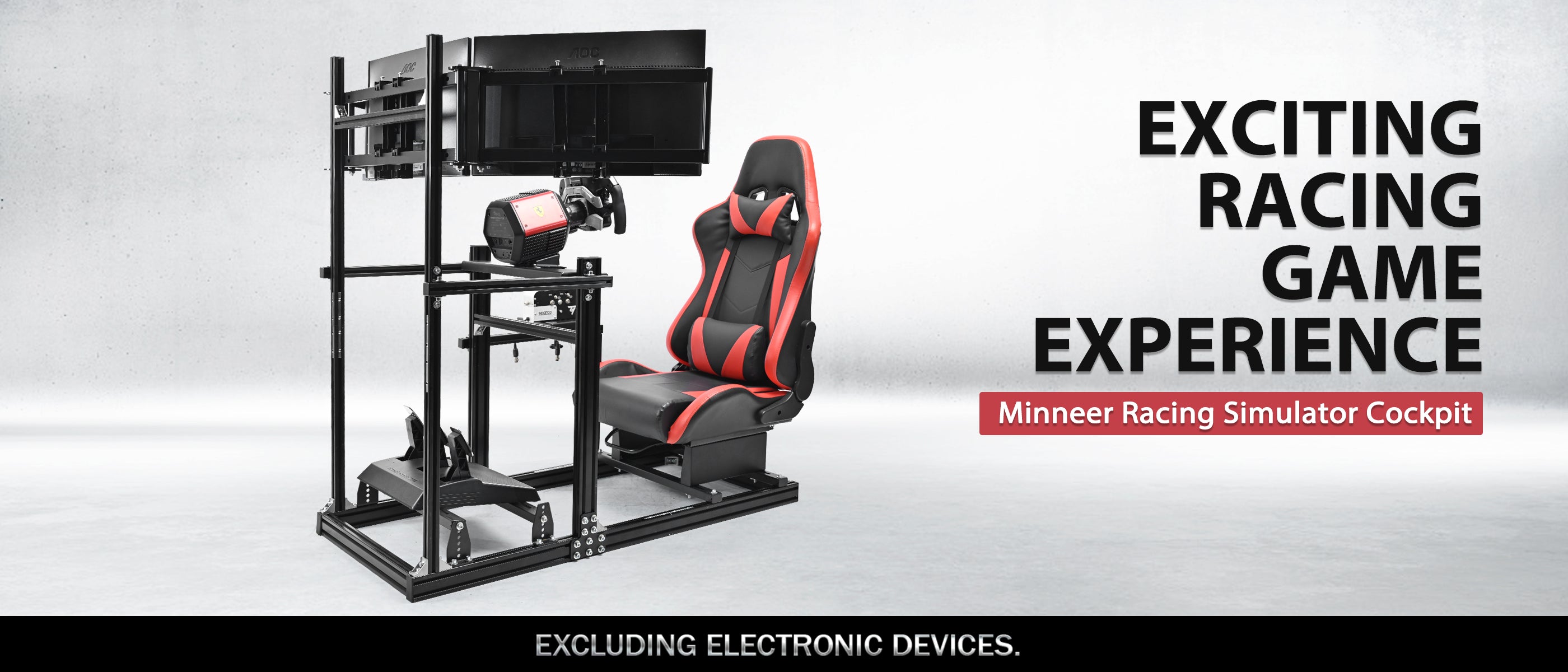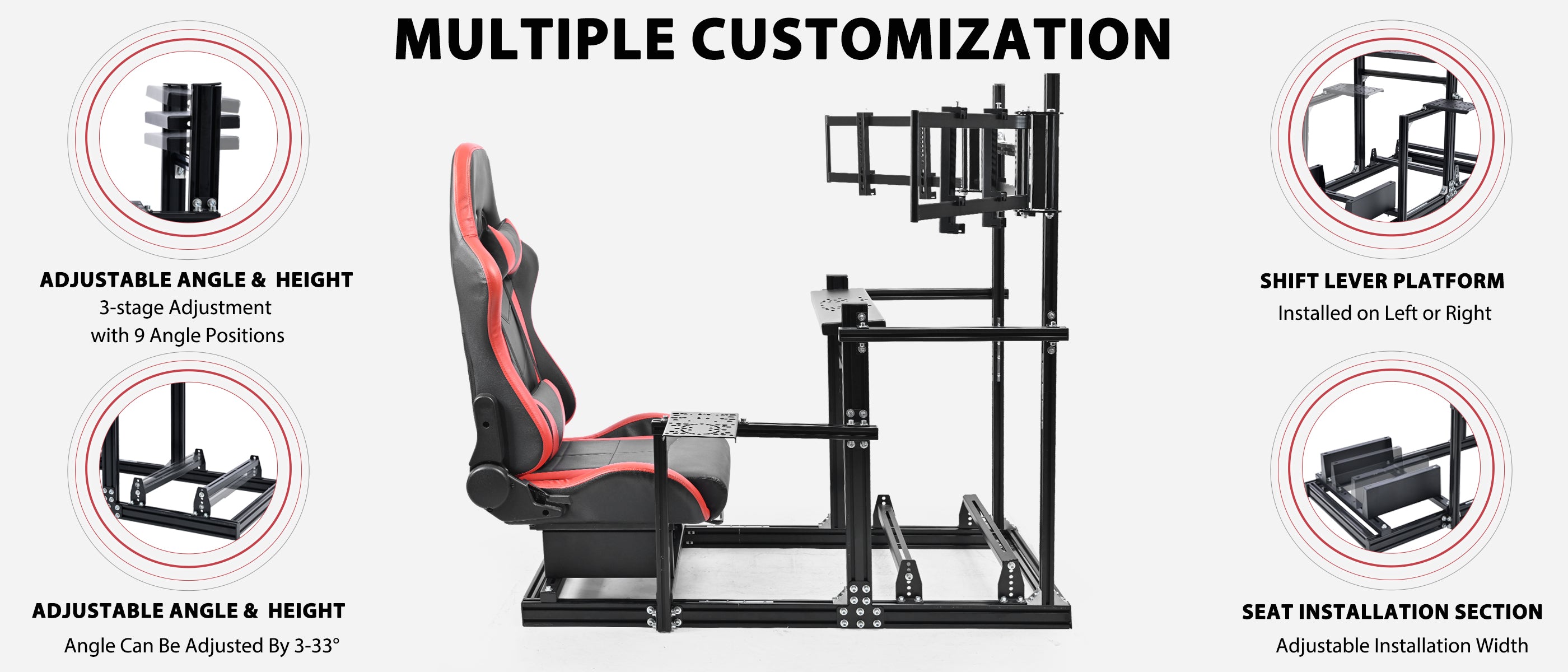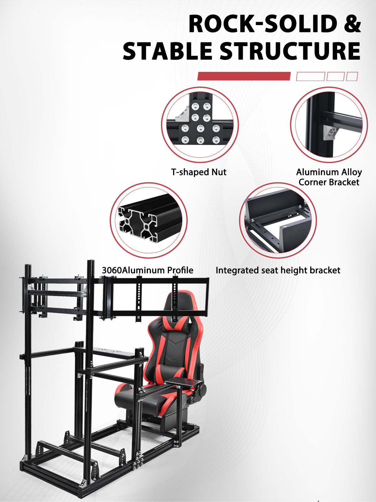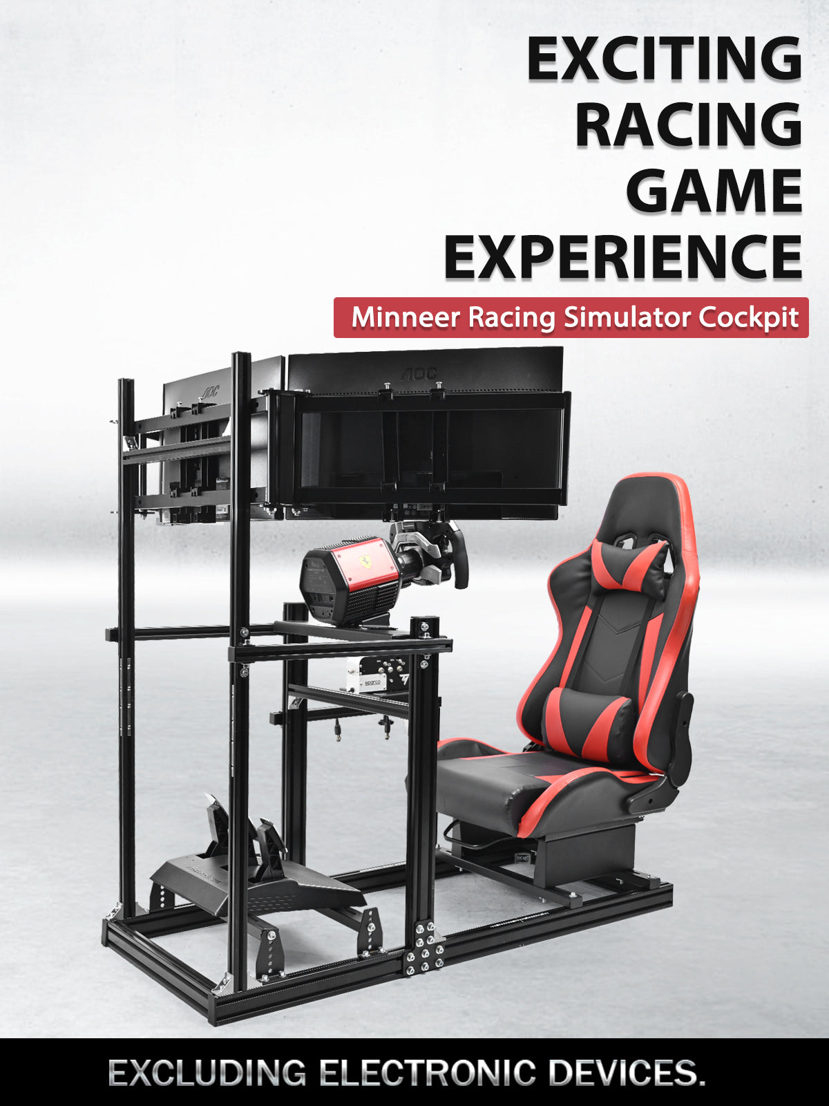 Minneer 3060 Aluminum Profiles Racing Simulator Cockpit with Red Seat and Triple Monitor Stand , Fully Adjustable, Fit for Logitech G29 G923, Steering Wheel, Pedals, and Hand Brake Not Included