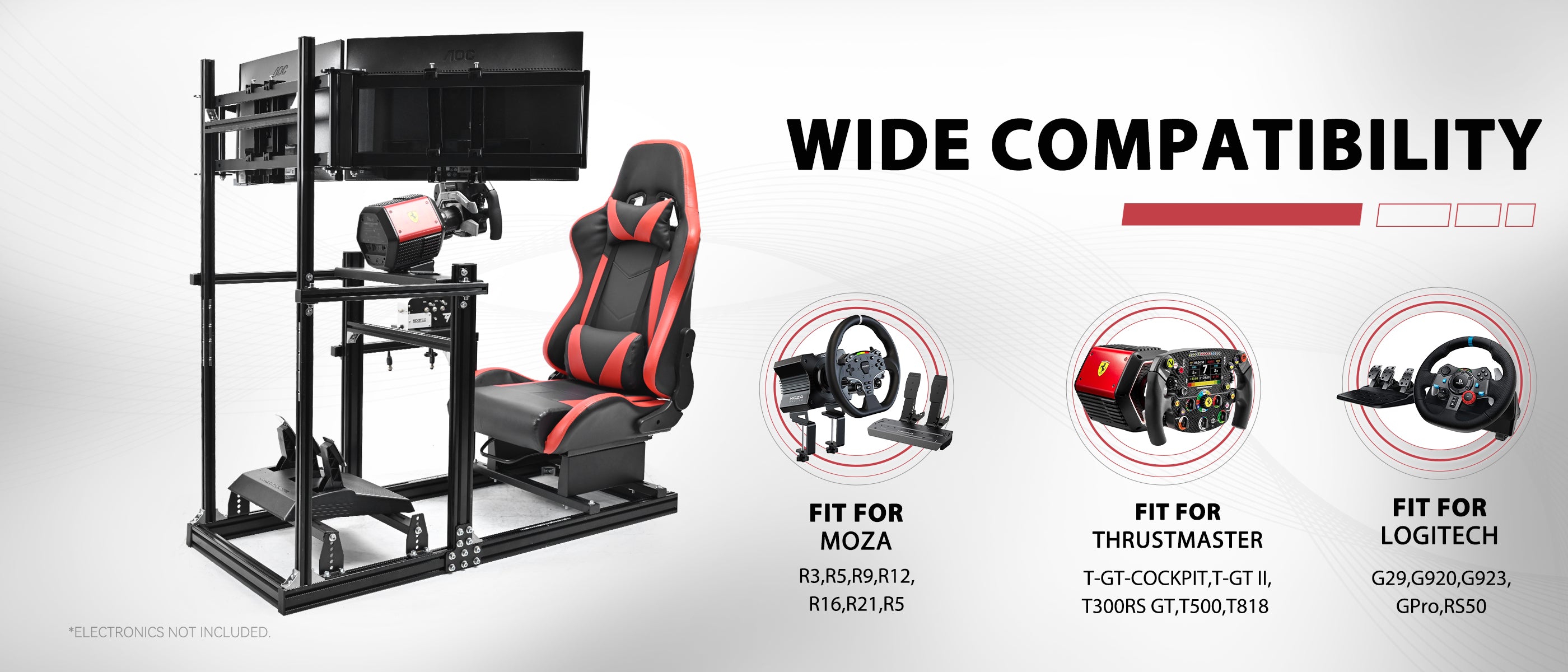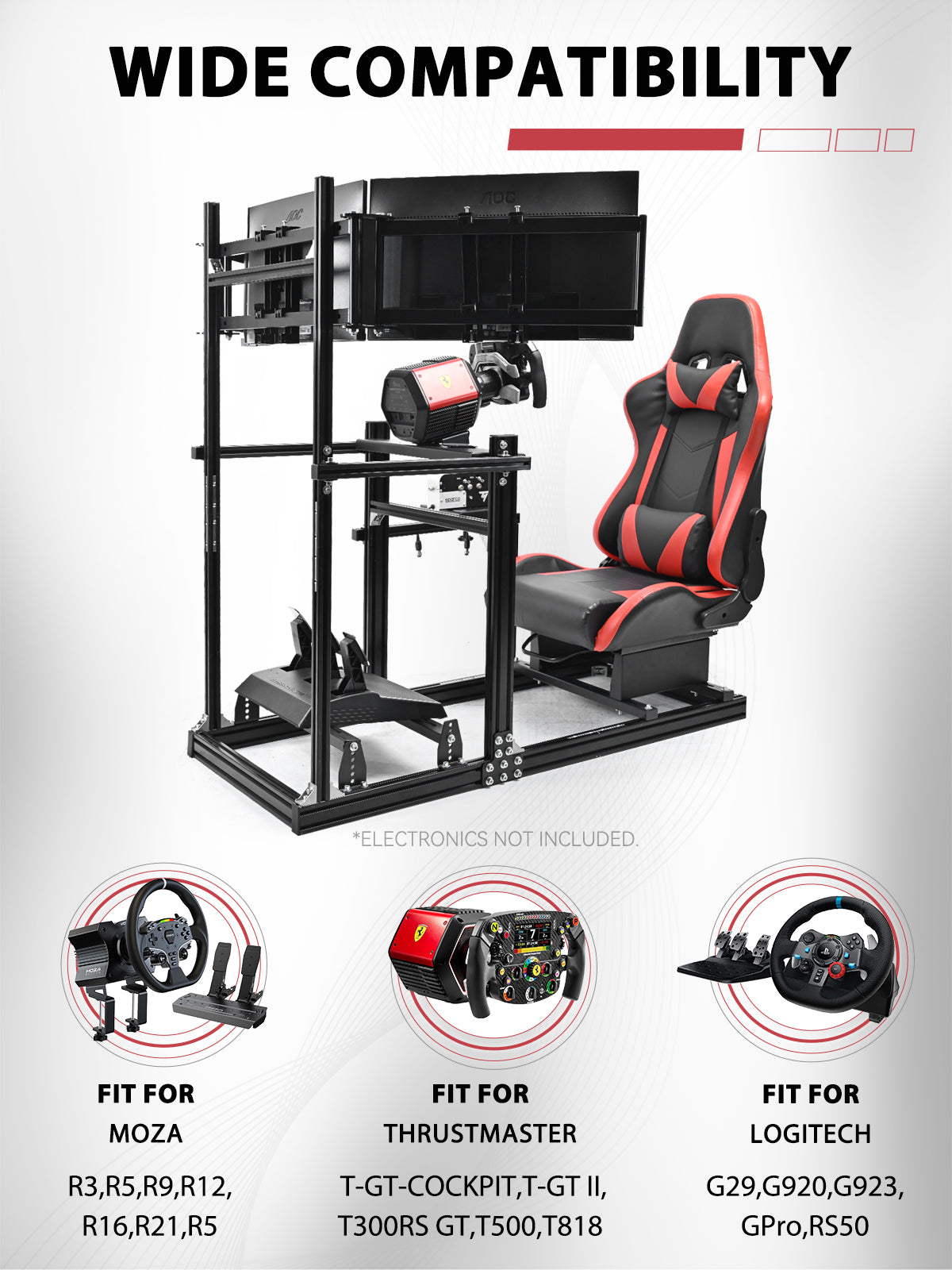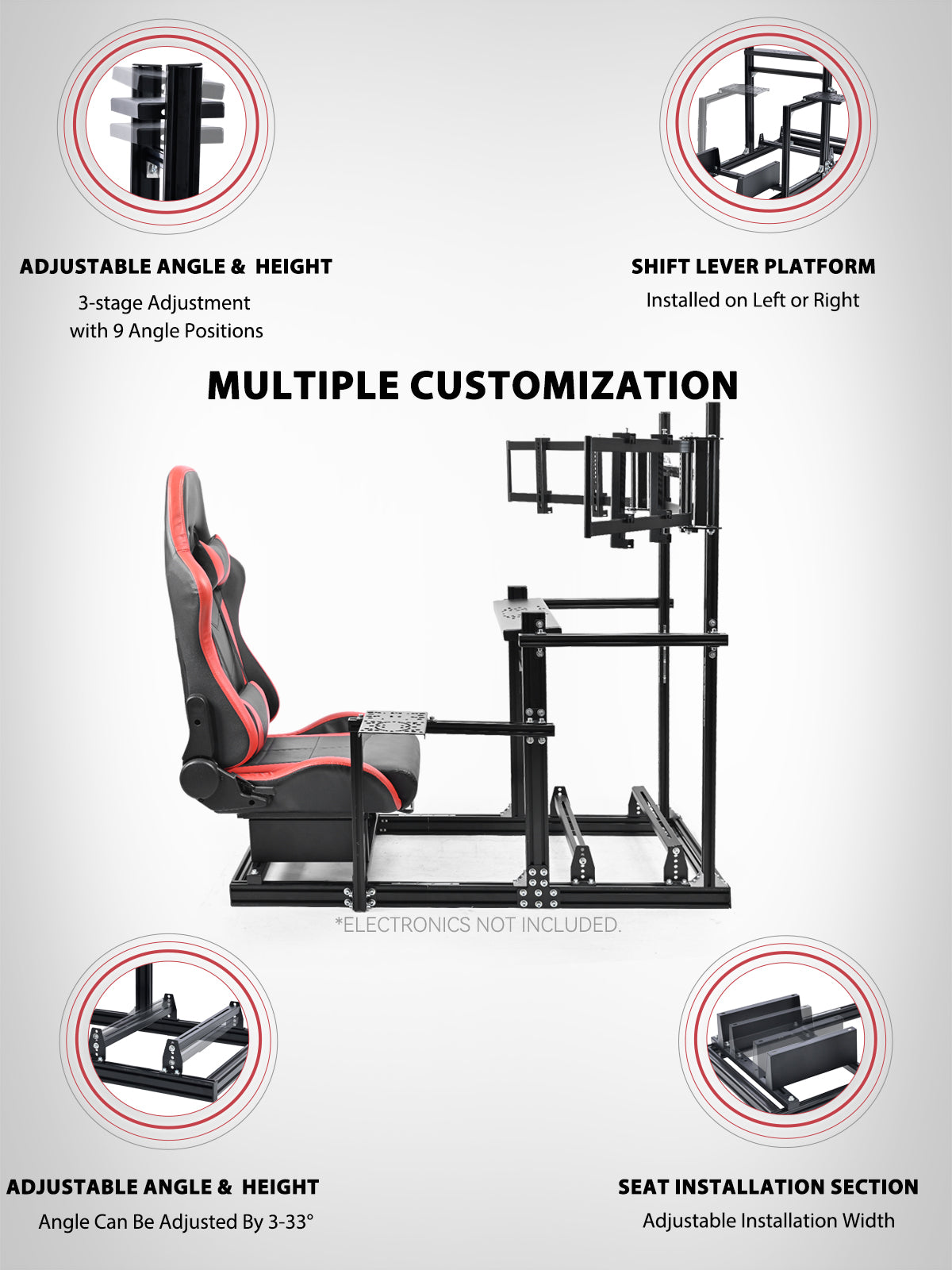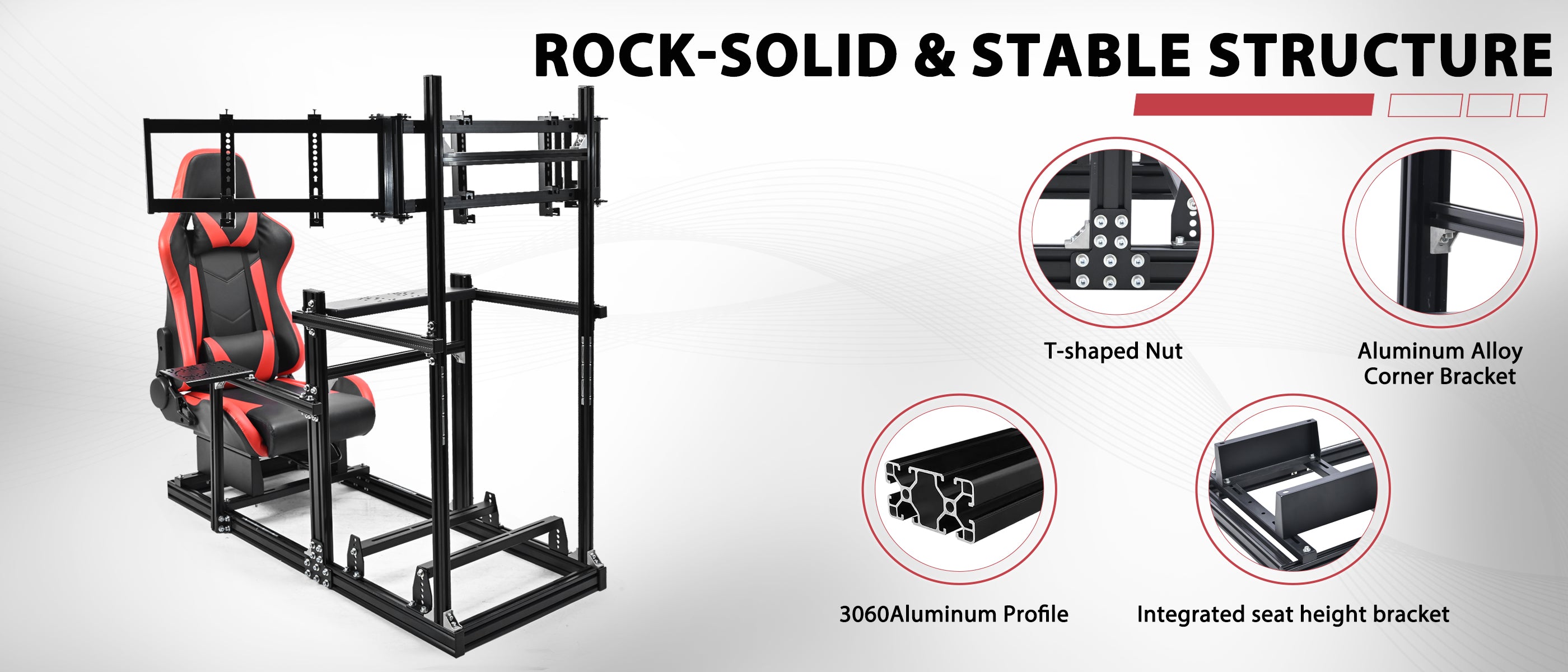 Minneer 3060 Aluminum Profiles Racing Simulator Cockpit with Red Seat and Triple Monitor Stand , Fully Adjustable, Fit for Logitech G29 G923, Steering Wheel, Pedals, and Hand Brake Not Included