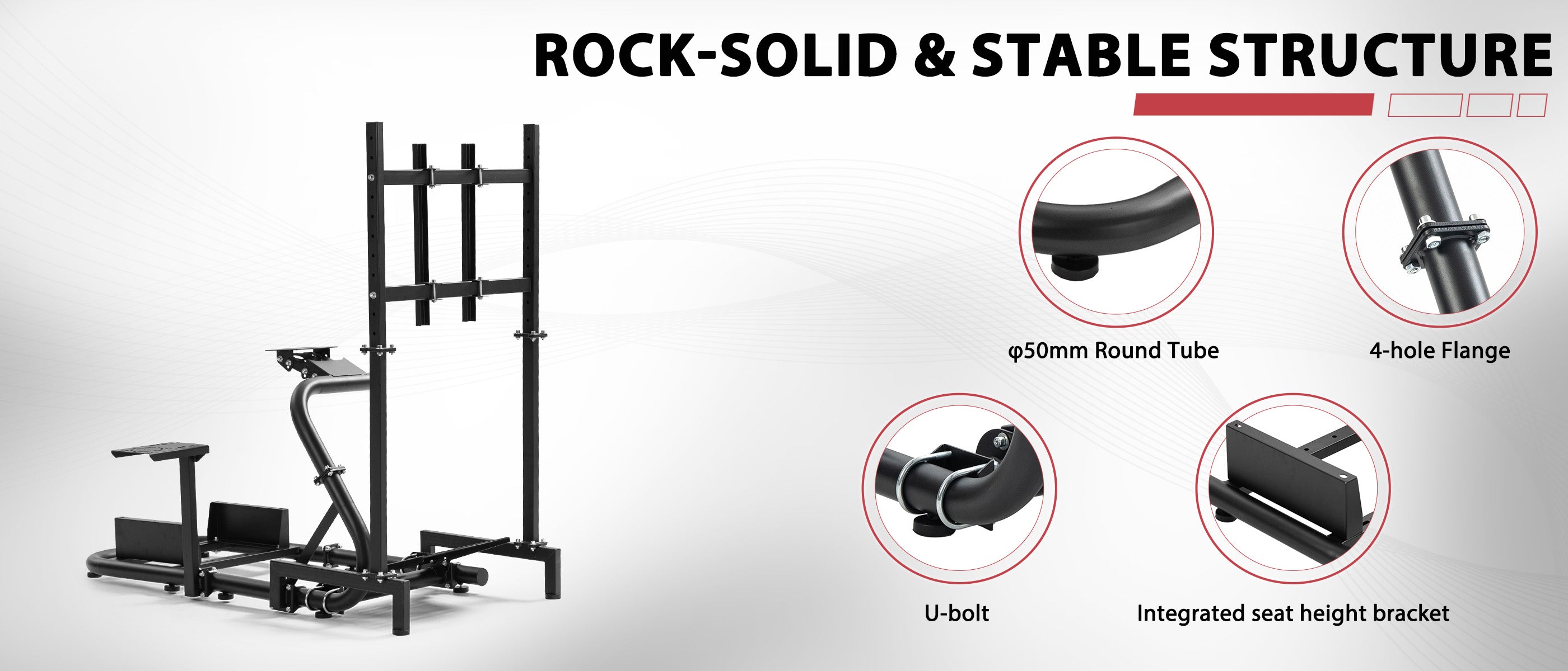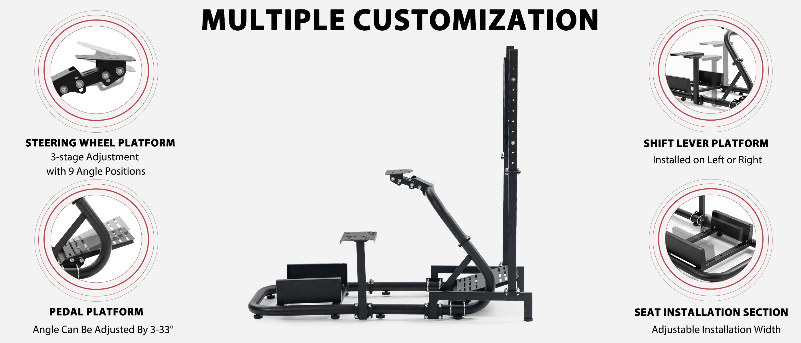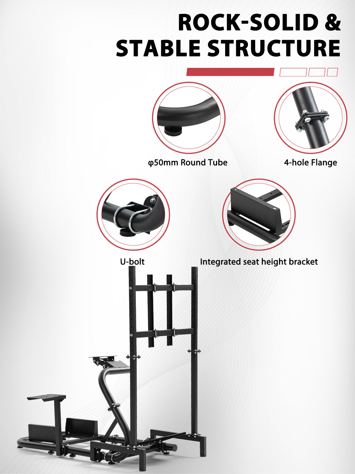 【Unique Design】The overall racing simulator cockpit is designed with a large 50mm diameter round tube, with U-bolt fixing for stable load-bearing capacity and easy adjustment