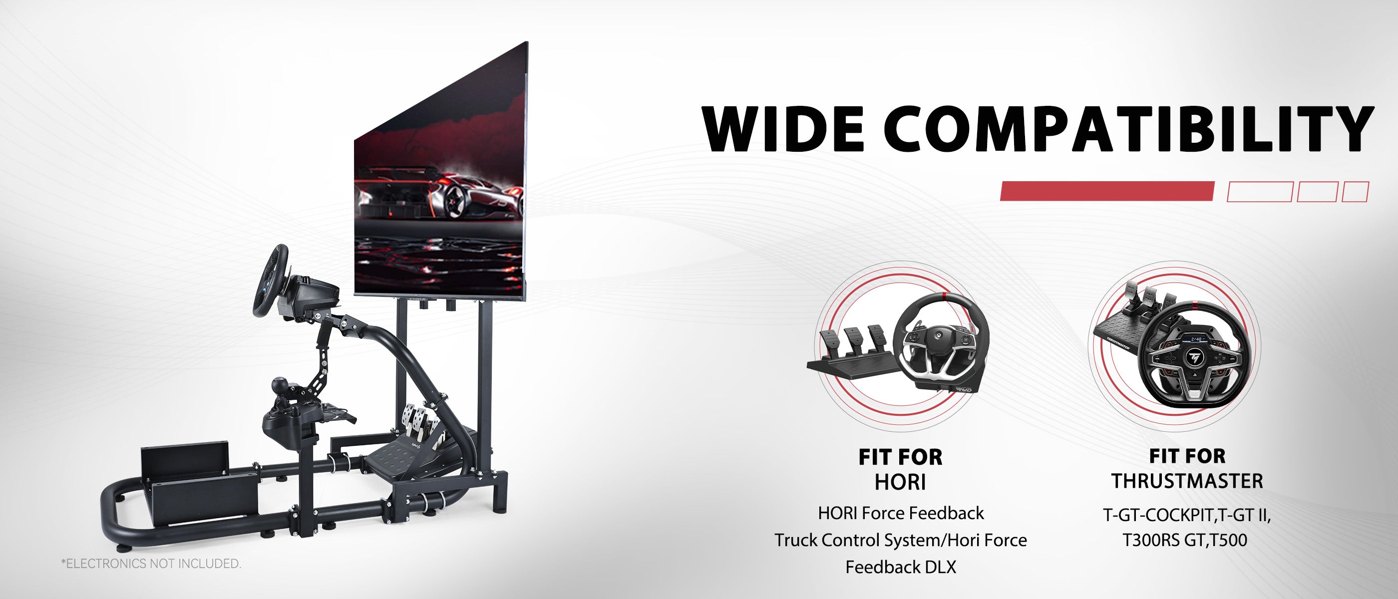 The steering wheel platform can be adjusted at any angle for perfect control in racing, and is compatible with popular steering wheels such as Logitech and Thrustmaster, making it an ideal companion for racing enthusiasts.