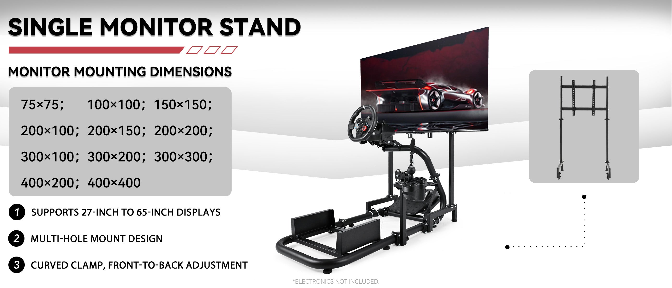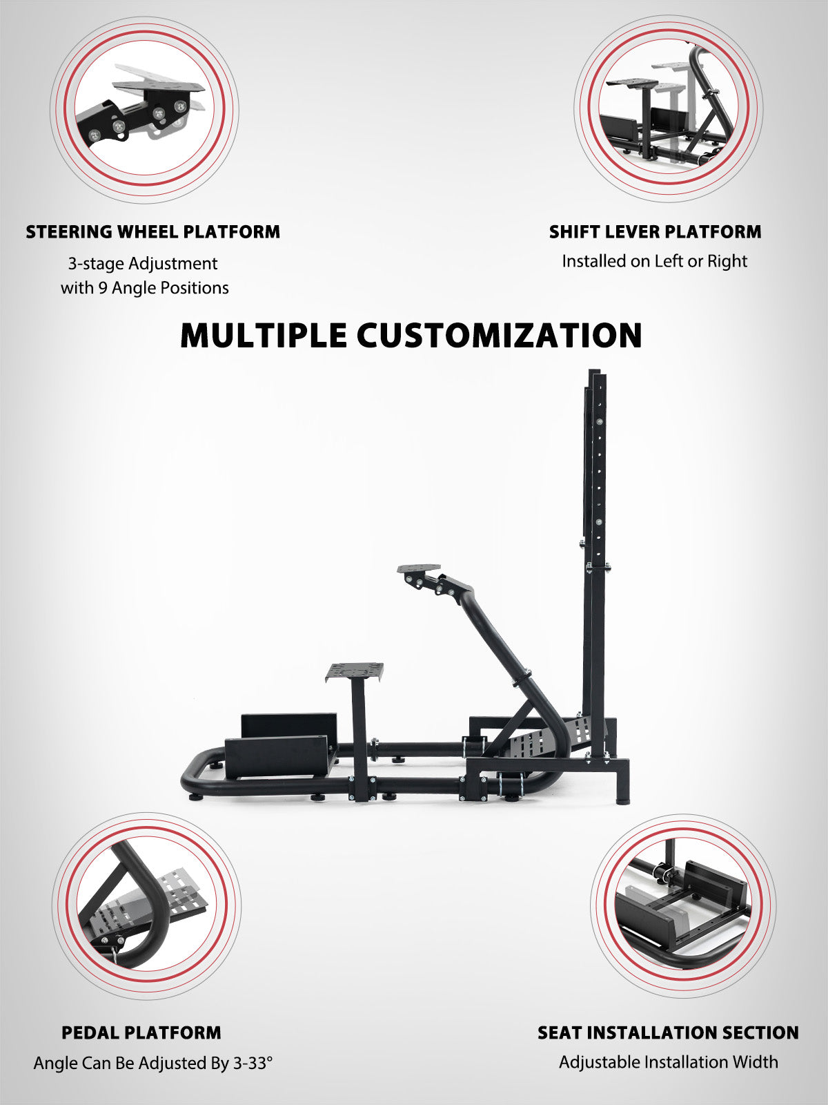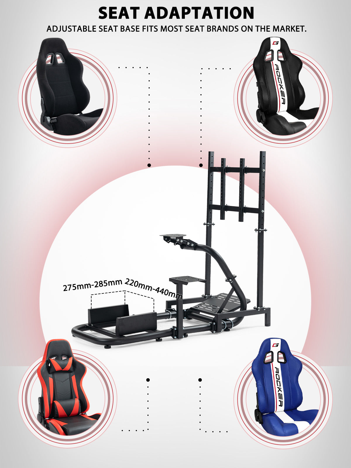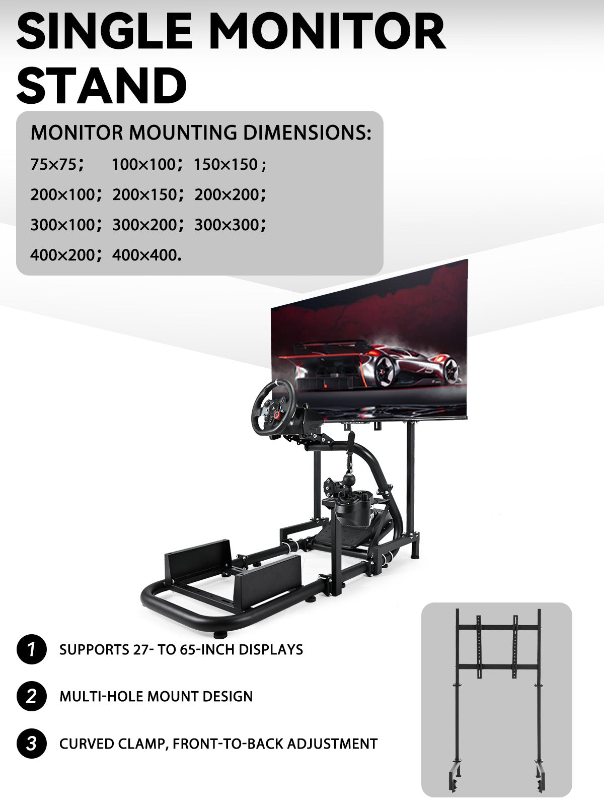 With a superb weight capacity of 220lbs, the monitor stand is perfectly compatible with all types of monitors from 27 to 65 inches and easily enhances your racing experience with its omni-directional adjustment feature.