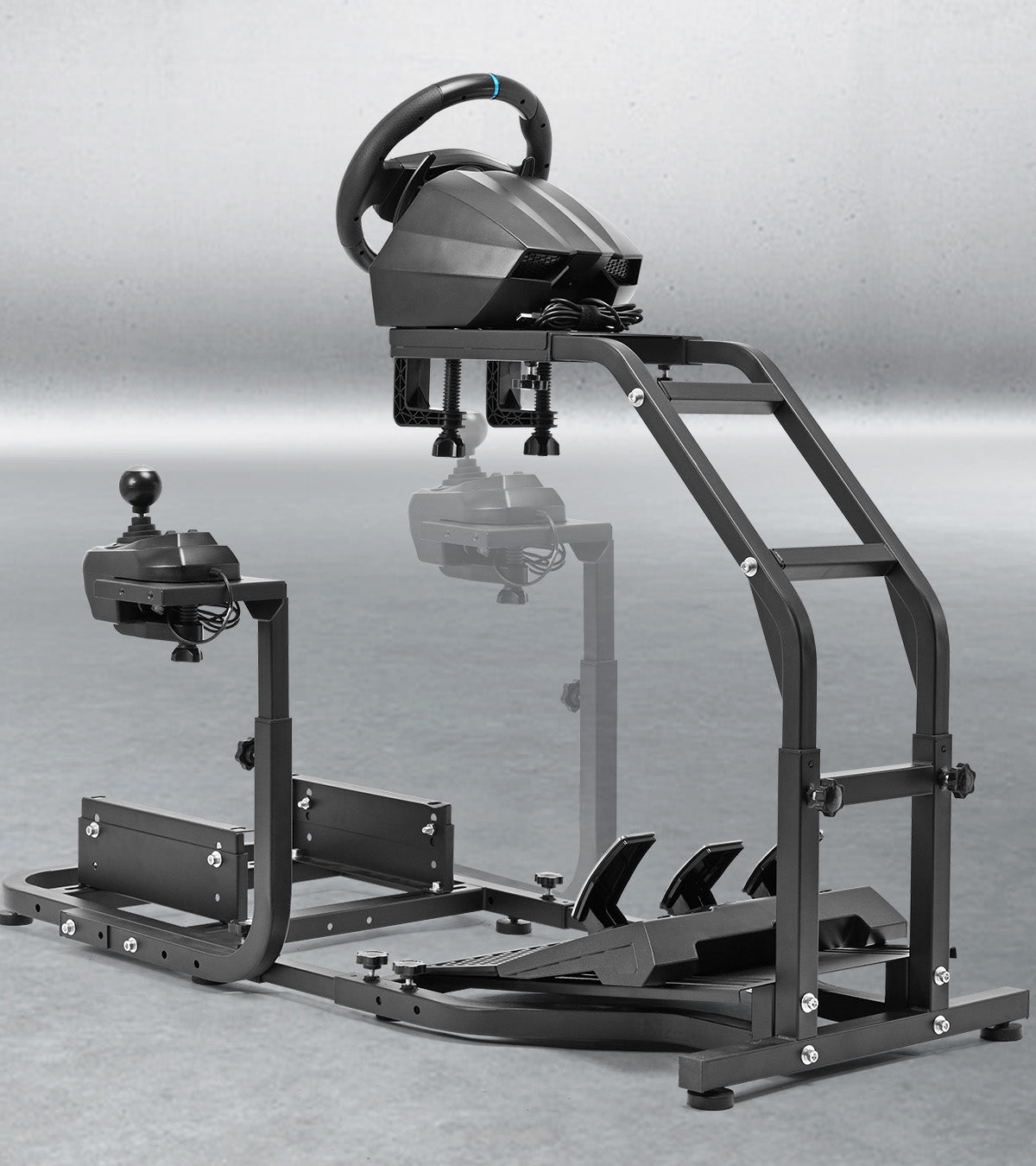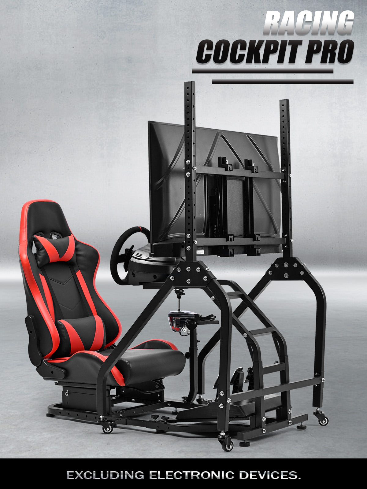 【Stable and Movable Monitor Stand】 Rolling stand with lockable wheels for easy repositioning. Multi-hole height adjustment for screens. Reinforced bolts ensure stability during intense racing simulations
