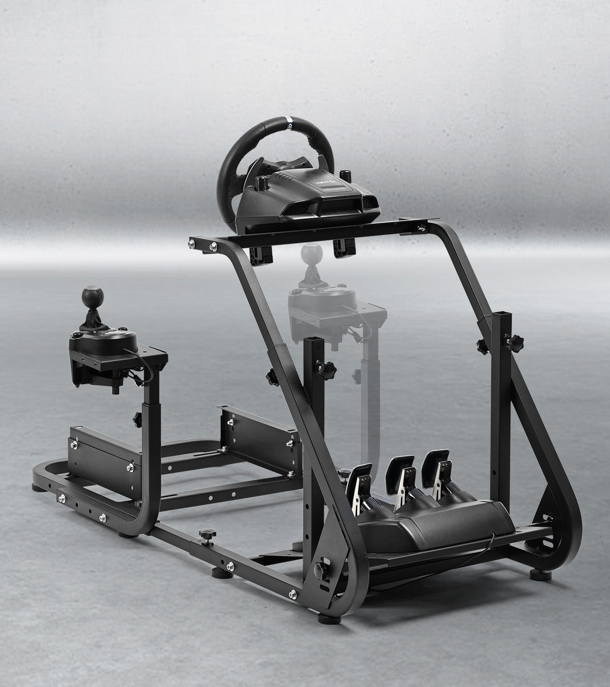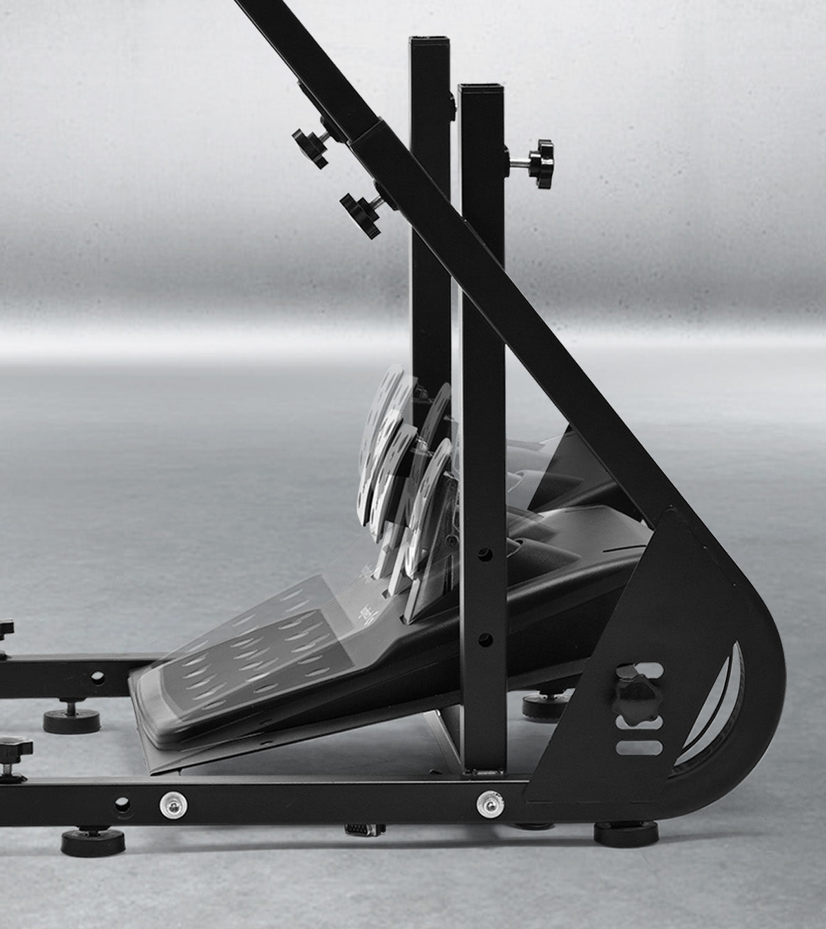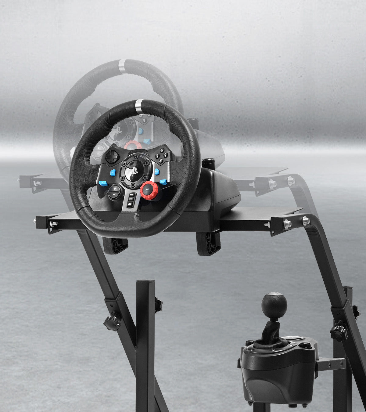 The steering wheel platform can be adjusted at any angle for perfect control in racing, and is compatible with popular steering wheels such as Logitech and Thrustmaster, making it an ideal companion for racing enthusiasts.